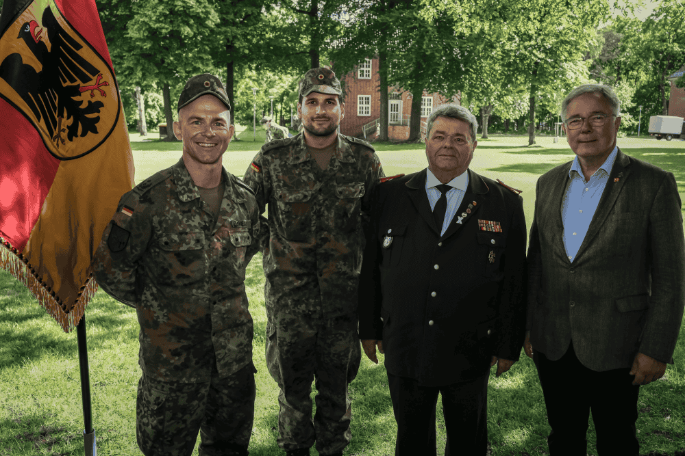 Rolf Heidenberger (Mitte) und Hans-Peter Lütje (2.v.re) freuen sich über das Engagement der Soldaten. Links Oberstleutnant Michael Wieger, 2.v.li. Hauptmann Dimitrios B., rechts Stabsfeldwebel Peter S.